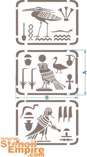 Комплект из трех панно на тему иероглифов Египта. Однослойные трафареты. Также быстро, как и предложенные размеры, мы изготовим любой другой по Вашему желанию. Узнать его стоимость можно прямо сейчас. Введите нужную Вам величину (первое значение) ниже списка стандартных и нажмите кнопку ЦЕНА. Автоматически посчитается второй размер, и Вы увидите его стоимость. Затем подтвердите выбор и кладите его в корзину.