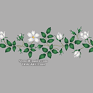 Бордюрный повторяющийся рисунок из дикой розы - шиповника. Распустившиеся цветы и закрытые бутоны на тонких стеблях с листьями. Однослойный трафарет для декора. Цветы могут быть любого другого цвета - какую краску купите.