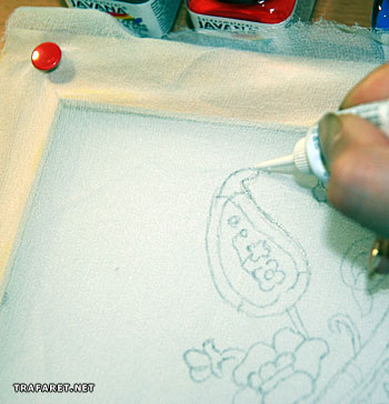 Под ткань помещаем рисунок из раздела ВИТРАЖИ. Смысл точно такой же, как и при витражной росписи - контуры просвечивают через ткань и хорошо видны. Можно рисовать.
