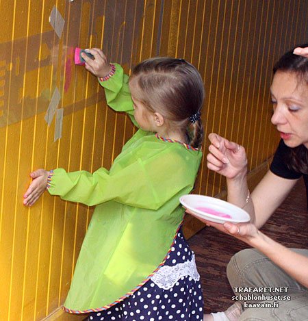 Первый слой закончен, можно снимать трафарет, что мы и делаем. Несмотря на небольшие огрехи, все выглядит замечательно - трафарет доступен и ребенку. Однако, присутствовавшие при покраске воспитатели, которые не были в курсе окончательного замысла и не подозревали о существовании второго слоя трафарета, на этом этапе скептически подумали "и это все?". Не, это не все!