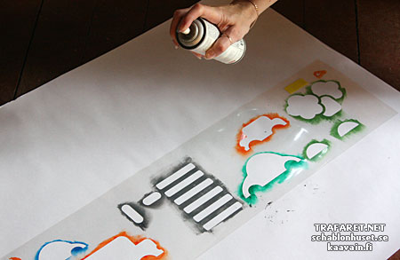 Используем аэрозольный клей. Как мы и говорили, это не обязательно. Но деревянный забор гладкий, и аэрозольный клей хорошо держит на нем трафарет. Учитывая, что рисуют дети, мы решили не экономить на спичках и крепить дальнейшие повторы и второй слой трафарета на клей. Переворачиваем трафарет и слегка покрываем его клеем, тонким, незаметным слоем.
